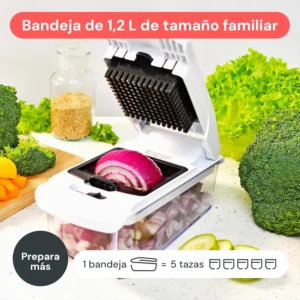 Esta herramienta de cocina multifunción permite picar, cortar y hacer espirales de verduras en un solo dispositivo. Es ideal para ensaladas, espaguetis de calabacín, cebolla picada, patatas y mucho más. Sus cuchillas de acero inoxidable afiladas hacen el corte más rápido y seguro que un cuchillo. Incluye un recipiente resistente para mantener la cocina limpia. Las piezas son fáciles de limpiar.